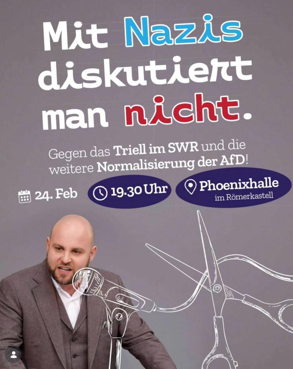 Deshalb wendet sich dieser Aufruf auch direkt an die Mitarbeitenden des SWR: Ihr müsst die Entscheidungen eurer Chefs nicht einfach hinnehmen. Ihr müsst nicht dabei helfen, die Rechtsentwicklung weiter voran zu treiben. Erhöht den internen und den öffentlichen Druck, bleibt am 24.02. der Arbeit fern, versucht die Veranstaltung zu blockieren oder zu stören. Organisiert euch sowohl inner-, als auch außerbetrieblich gegen Rechts. Kommt gerne mit uns in den Austausch,falls ihr dabei auf der Suche nach Anlaufstellen seid. Lasst uns Informationen zum Triell zukommen und helft dabei, die weitere Normalisierung der AfD zu stoppen.