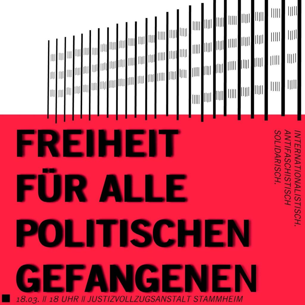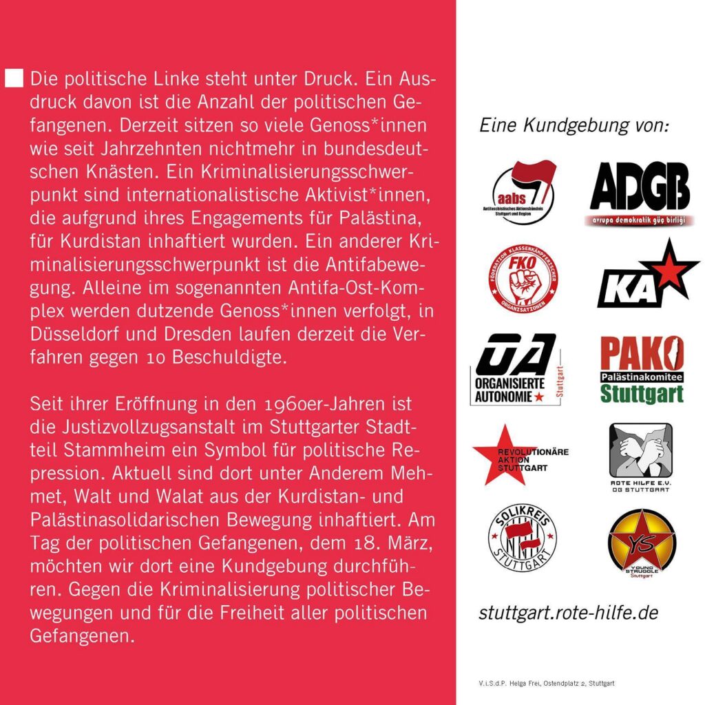 Seit ihrer Eröffnung in den 1960er-Jahren ist die Justizvollzugsanstalt im Stuttgarter Stadtteil Stammheim ein Symbol für politische Repression. Aktuell sind dort unter Anderem Mehmet, Walt und Walat aus der Kurdistan- und Palästinasolidarischen Bewegung inhaftiert. Am Tag der politischen Gefangenen, dem 18. März, möchten wir dort eine Kundgebung durchführen. Gegen die Kriminalisierung politischer Bewegungen und für die Freiheit aller politischen Gefangenen.