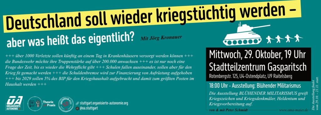 Doch zur militärischen Aufrüstung gehört mehr als Waffen und Zahlen. Mitten in einer tiefen Krise sorgt eine Propagandamaschinerie mit Bundeswehrwerbung und „moralischer“ Vorbereitung auf Kriegszeiten dafür, dass die Bevölkerung an den Gedanken von Krieg gewöhnt werden soll. Gleichzeitig soll sie bereit sein, den „Gürtel enger zu schnallen“ und für die deutschen Kriegsinteressen auf das ein oder andere zu verzichten.